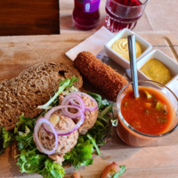 Sfeervol restaurant mooie bloemen in restaurant en ook mooi terras. Aardig personeel. Had 12 uurtje, erg lekker al neem ik volgende keer wit brood ipv bruin, met tafelgenoot had 2x zo grote boterhammen (in restaurant niks v gezegd trouwens)